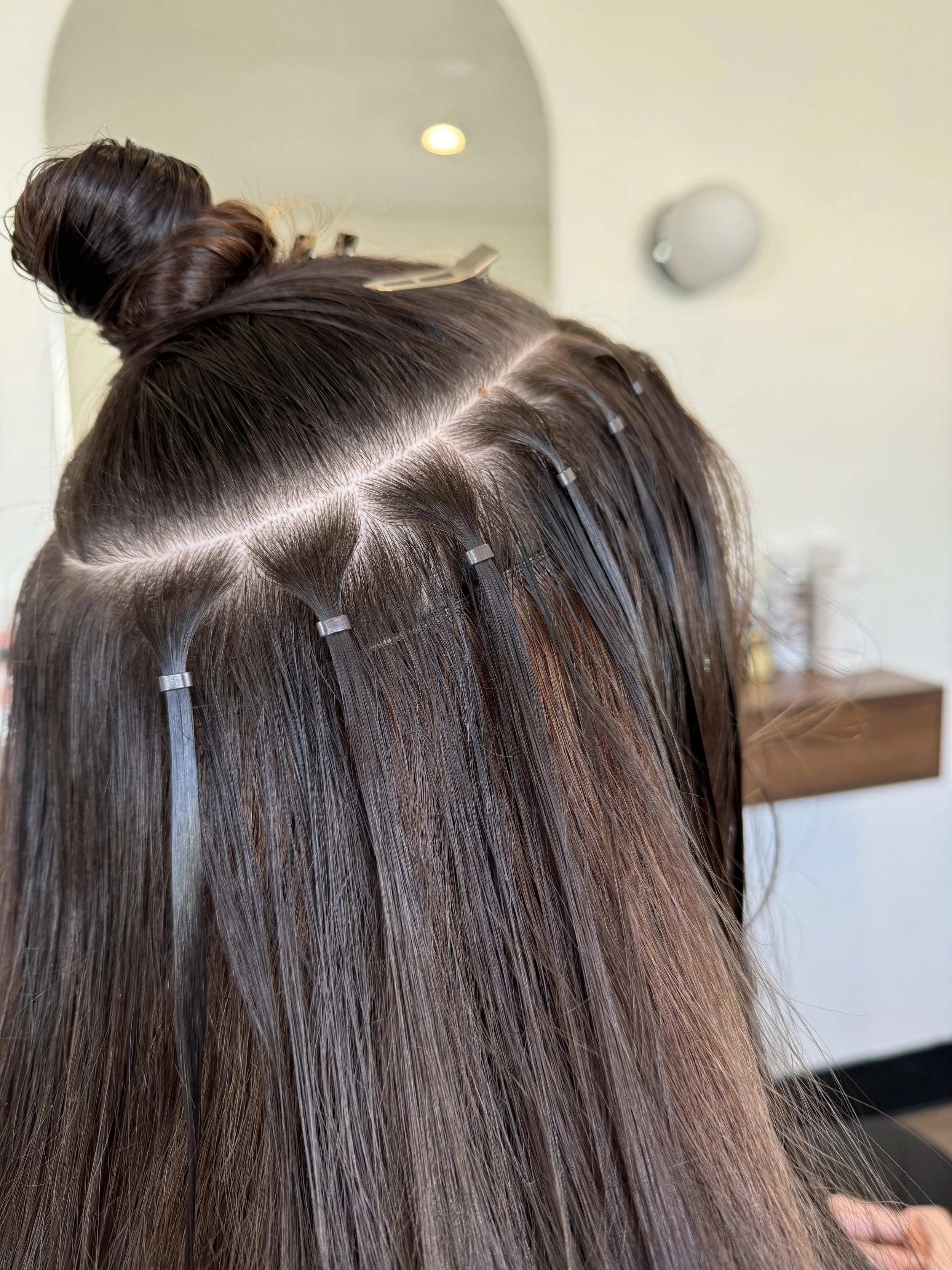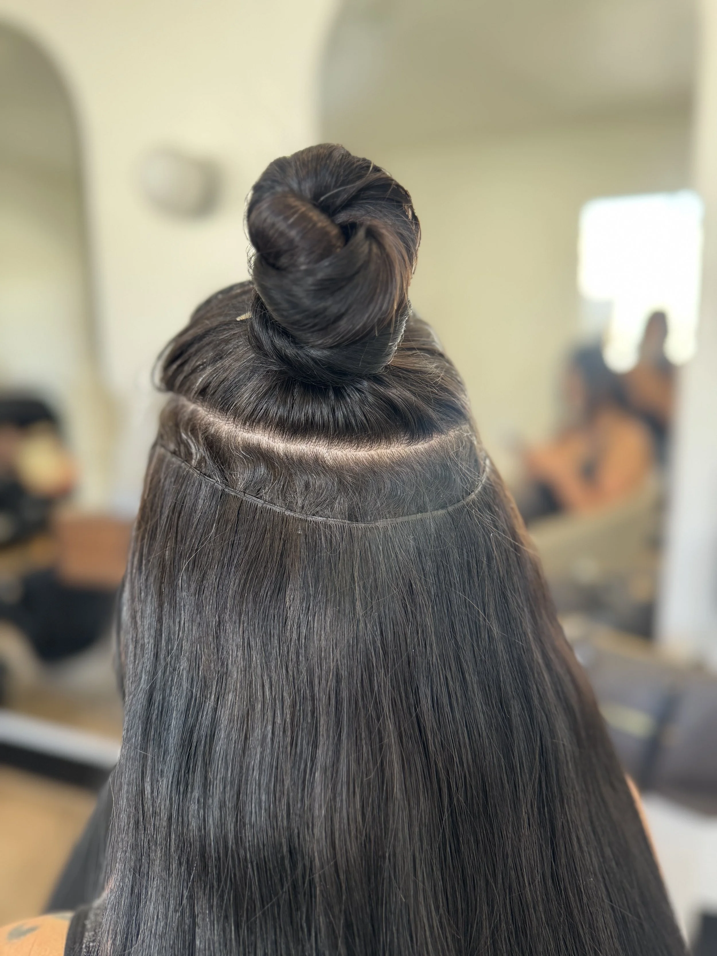 our weft extensions are made to last. they can last anywhere from 8 to 10 months. we recommend coming in every 6–8 weeks for a move-up to keep them secure, seamless, and looking their best.