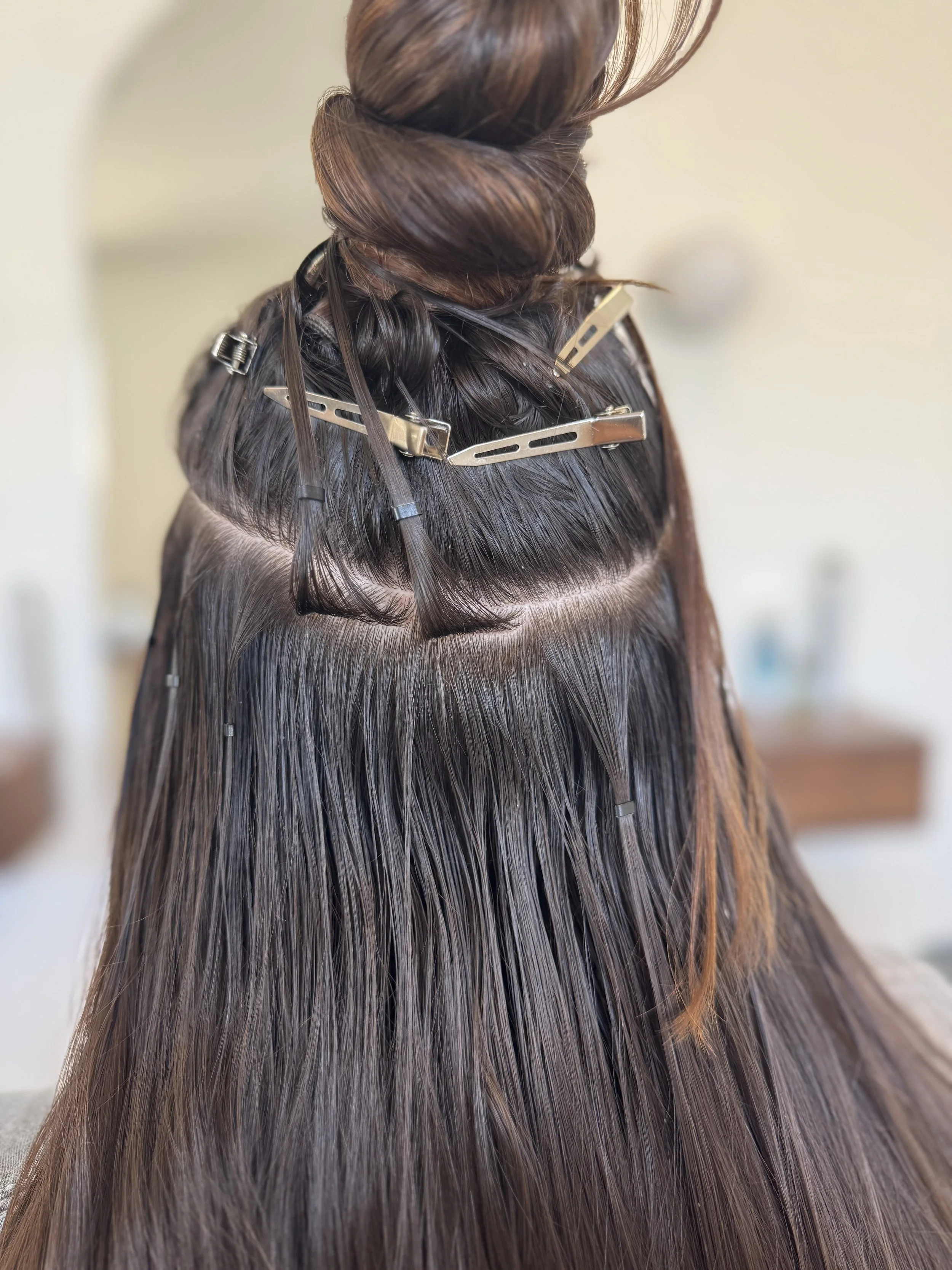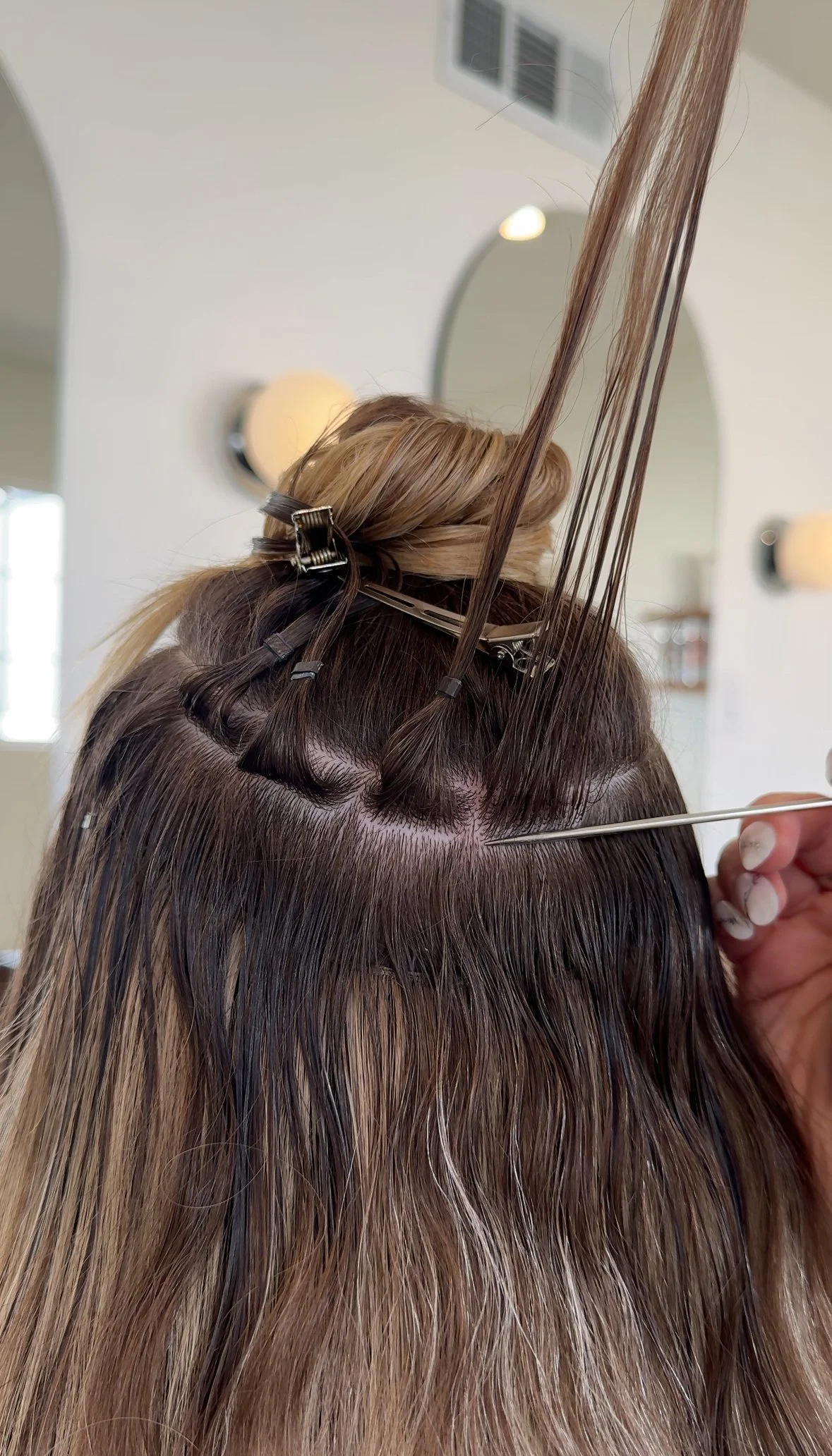 weft hair extensions are installed by creating a secure base using beads and then sewing the wefts onto that base. it’s a customizable, gentle method that doesn’t require heat or glue. so it’s great for maintaining the health of your natural hair. we tailor every install to your hair type and lifestyle, so whether you want one row for fullness or multiple rows for maximum length, we’ll customize an install that works for you. and because weft extensions are so secure and flat to the scalp, they grow out beautifully and stay comfortable in day-to-day life.